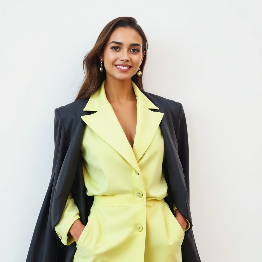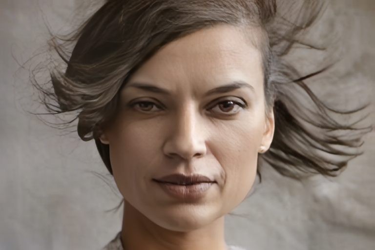 A woman brushes her hair from under her dark grey jacket and then smiles. | ![]() |