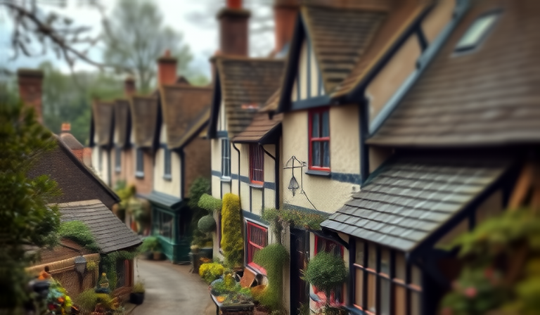 A traditional english village, tilt-shift photography. The camera begins with a wide aerial shot, then cranes down and around to the door on the right. | ![]() |